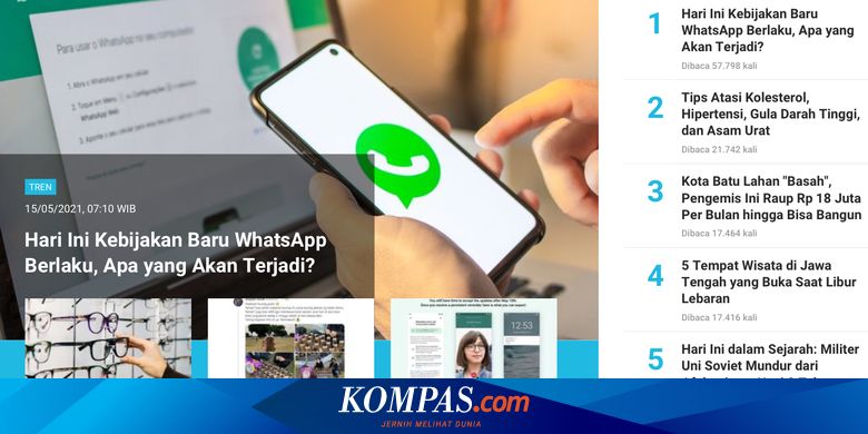KOMPAS.com - Pemberlakuan kebijakan baru Whatsapp pada 15 Mei 2021 dan apa yang terjadi setelahnya menjadi berita yang paling banyak dibaca di Tren, Sabtu (15/5/2021) hingga Minggu (16/5/2021).