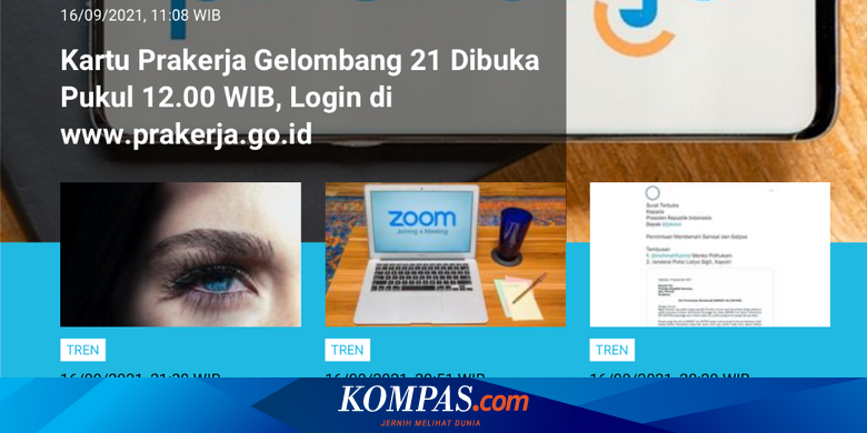 KOMPAS.com - Berita tentang pendaftaran Kartu Prakerja gelombang 21 menjadi berita paling banyak dibaca di kanal Tren Kompas.com, Jumat (17/9/2021).