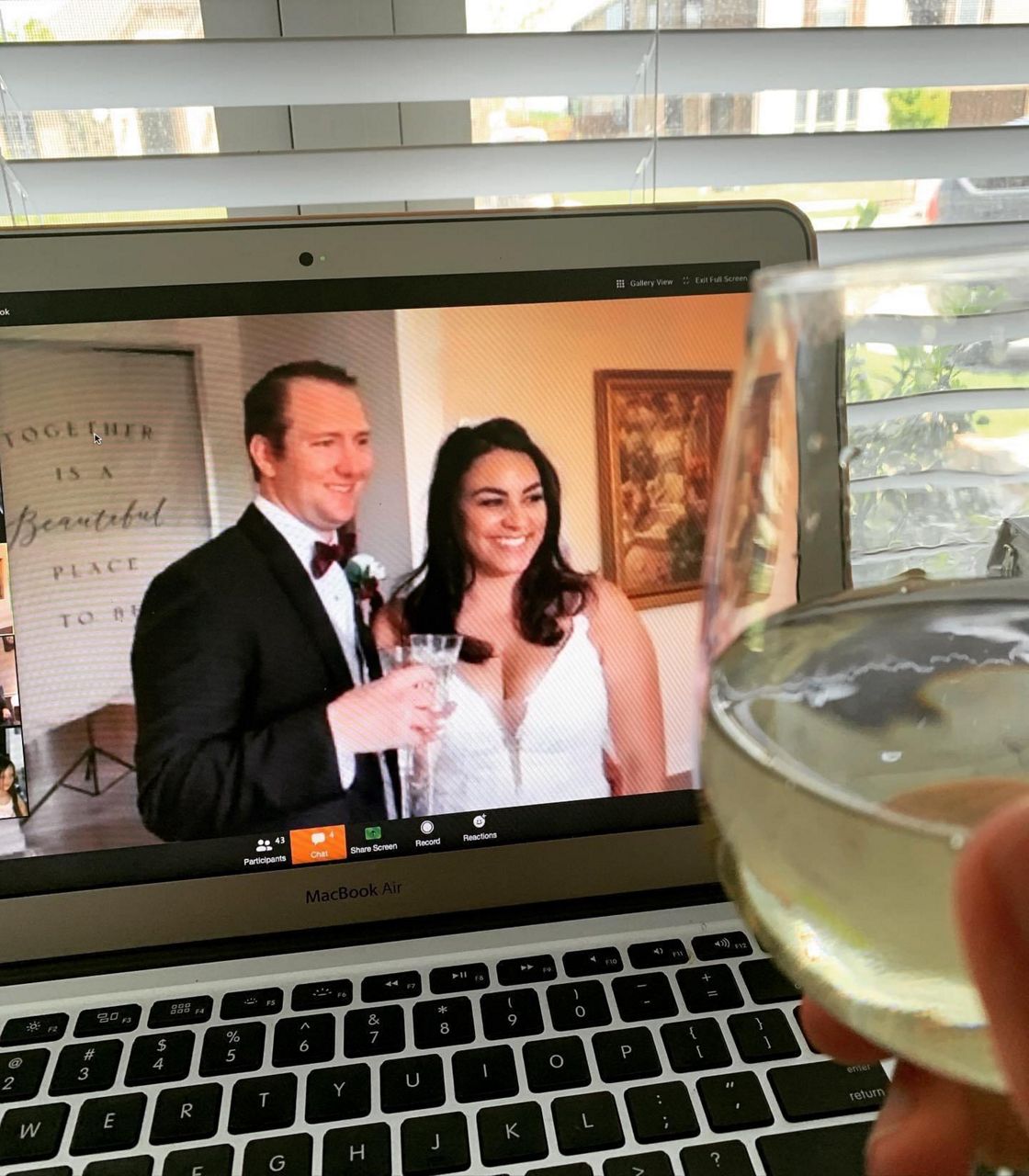 Bridesmaids wore their dresses and friends did virtual cheers. One person even put the bride's face on a mirror so she could toast her glass.