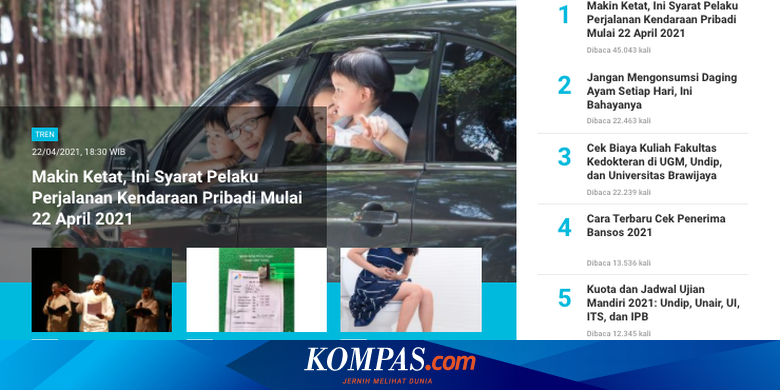 KOMPAS.com - Berita mengenai syarat pelaku perjalanan kendaraan pribadi, menjadi berita paling banyak dibaca di kanal Tren, hingga Jumat (23/4/2021) pagi.