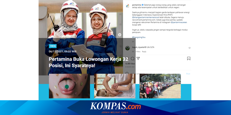 JAKARTA, KOMPAS.com - Ada lowongan kerja dengan berbagai posisi di Pertamina Group. Berita soal lowongan kerja Pertamina ini menjadi salah satu berita yang paling banyak dibaca di laman Tren sepanjang Sabtu (6/11/2021) hingga Minggu (7/11/2021).
