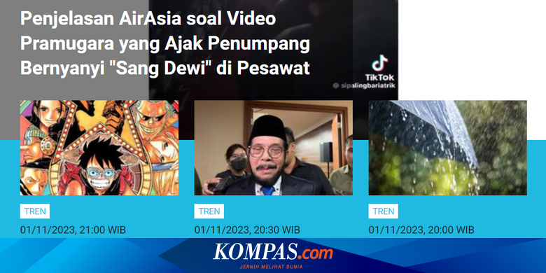KOMPAS.com - Kanal Tren Kompas.com menyajikan berbagai berita sepanjang Rabu (1/11/2023) hingga Kamis (2/11/2023) pagi.