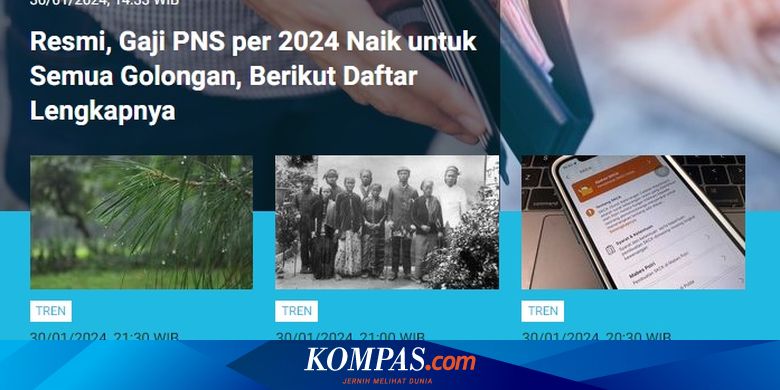 KOMPAS.com - Salah satu populer kanal Tren sepanjang Selasa (30/1/2024) adalah soal kenaikan gaji PNS semua golongan per 2024.